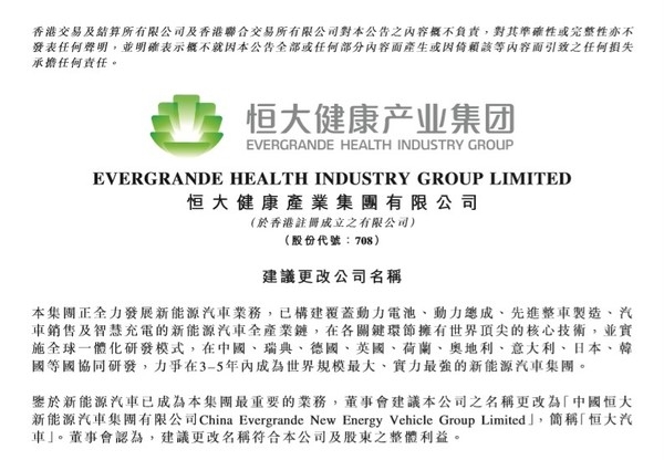 7月27日,恒大健康产业集团有限公司发布公告称,董事会建议恒大健康改名为恒大汽车,全名为中国恒大新能源汽车集团有限公司。据恒大官方消息,新能源汽车已经成为恒大健康产业集团最重要的业务。董事会认为,改名符合公司及股东的整体利益。改名在中国很流行,很多明星或企业都是改名后一路走红。曾经很多明星富商亲自到湖南长沙拜访无量子,以求改一个利于发展好名字。
