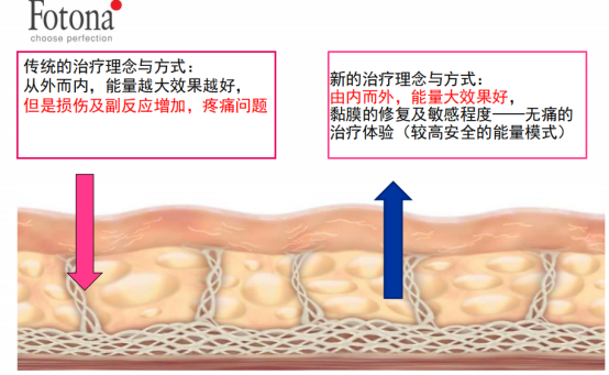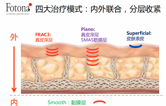 Fotona 4D的能量源是激光,操作是针对筋膜、皮下脂肪、真皮、表皮不同的层次,采用4种激光模式,分层解决相应的问题,效果是循序渐进、叠加的。