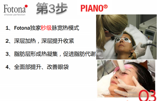 2、PIANO深层加热溶脂技术,用超脉宽1064纳米技术进行深层加热,瞬间将温度提高到40-60度以上,在表皮完好无损的前提下将多余脂肪进行溶解。